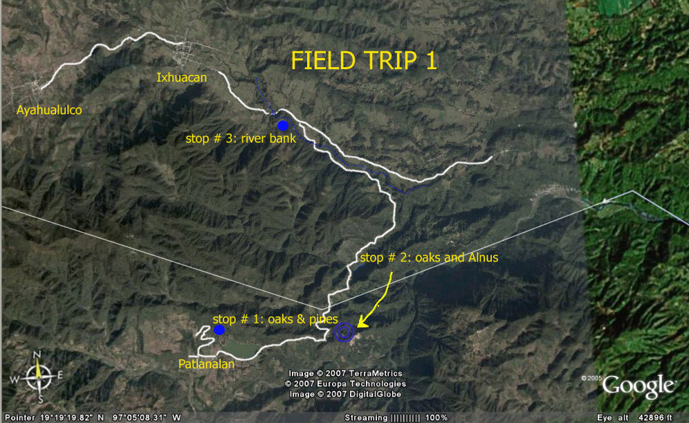 Site # 2, State: Veracruz. Municipality: Xico. Locality: Hills west of Xico, near Pextlan bridge, side of road to Tlacuilolan and Coatitlan. Vegetation: Trail along and above the Coyopolan River; a) beginning of path: Elevation: 4450 ft. 19°25.543'N, 97°01.456'W b) near cabin along river Elevation: 4460 ft. 19°25.575N, 97°01.522'W
