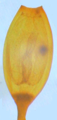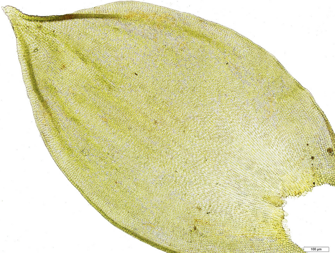 Description. Plants medium-sized in dense mats; stems with sympodial branching, plagiotropic, (3–)4–5(–6) cm long, scarcely branched; branches short, erect; flagelliform branches rare; pseudoparaphylia foliose, with papillose cells. Leaves ovate, widest point at or above middle of leaf; acumen abruptly differentiated, to 1/6 length of leaf, short acuminate, concolorous, 1.7–1.9 × 0.9–1.2 mm, leaf lamina flat or slightly concave, imbricate, erect-patent when dry, spreading when moist, weakly plicate; margins reflexed or recurved from base up 1/2 the leaf length or less, margin plane above, serrulate to erose at acumen; apical leaf cells 13–22 µm long, elliptic (3–4:1), sinuose, with few low marginal papillae; upper and median leaf cells (7-)9-13(14) µm long,quadrate to rectangular (2–3:1), walls weakly sinuose, papillae low, on side walls, overarching lumina. Autoicous. Archegonia distal on long vaginula (1.3–1.5 mm); perichaetial leaves oblong lanceolate, 2.3–2.7 mm long, slightly longer than vegetative leaves, acuminate, plicate; perichaetial paraphyses biseriate at base, 2–3 times longer than archegonia, immersed. Setae (5)7–11(13) mm long; capsule exserted, necks 0.3–0.4 mm long, gradually differentiated, slender, urns 1.2–1.6 mm long, cylindrical, mouth narrow, nearly as 1/2 the urn width, capsule walls smooth, or wrinkled when dry, exothecial cells polygonal; stomates superficial; opercula base conical, short oblique rostrate. Calyptrae cucullate, large, 2.8–3.7 mmhairy. Spores unicellular, 25–32 µm in diameter.