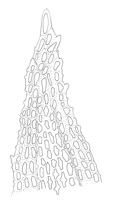 8b. Leaf acumen concolorous, sometimes hyaline but only at the leaf tips; leaf margin at apex entire; leaf apical cells quadrate to subquadrate .............................. 10 |