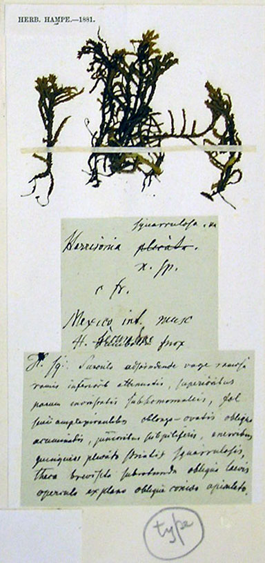 Nomenclatural notes. I have seen five duplicates of the Schlechtendahl collection. The best specimen (BM-HB HAMPE, sheet 48), designated here as lectotype, consists of three pieces. Each piece is composed of an elongate sympodium, with short terminal modules and few short branches. One stem has two short setae (3–4 mm) although broken at the capsule neck. The specimen is supplemented by a hand written description in Latin, which matches the published original description of the species. | |