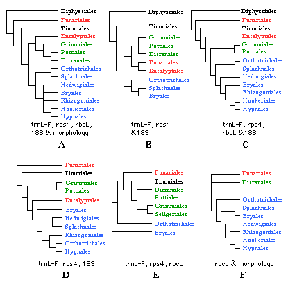 El clado mas derivado dentro de Bryidae incluye ordenes con endostomas ciliados: Bryales, Rhizogoniales, Hookeriales e Hypnales (Cox et al 2000, De Luna et al 1999). Los Hedwigiales son interpretados como un ejemplo de pérdida de peristoma, y permanece incierto si ellos pertenecen al clado de ciliados. Relaciones filogenéticas dentro de Bryopsida. Ordenes en los Dicraniidae en verde, ordenes en los Bryidae en azul. A. Árbol de Newton et al (2000, p. 195). B. Árbol de Goffinet y Cox (2000, p. 218). C. Árbol de Cox et al (2000, p. 235). D. Árbol de Cox y Hedderson (1999, p. 126, 132). E. Árbol de La Farge et al (2000, p. 265). F. Árbol de De Luna et al (1999, p. 642) y De Luna et al (2000, p. 251). | Bryopsida 1. Diphysciales, Funariales, Timmiales, Encalyptales, 2. Grimmiales, Dicranales, Pottiales, Fissidentales, 3. Orthotrichales, Splachnales, Hedwigiales, Bryales, Rhizogoniales, Hookeriales e Hypnales.