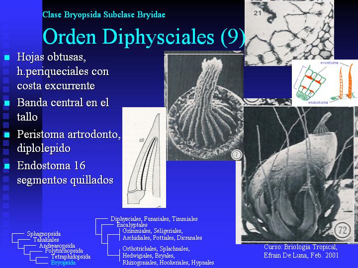 Sinopsis de la clasificación de los musgos: Bryopsida (1) Ordenes: Diphysiales, Funariales, Timmiales y Encalyptales |