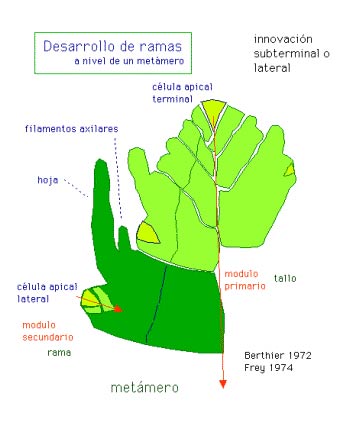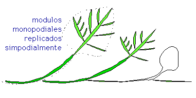 SISTEMAS DE RAMAS. Aunque todos los merofitos a lo largo del módulo desarrollan una célula apical lateral, no todas estas células apicales se segmentan y producen una yema lateral y eventualmente un nuevo módulo. Además de variar la posición de origen de las ramas, también por sus características morfológicas pueden ser homogéneas o heterogéneas, según su orden ontogenético o su posición estructural. Estos factores en combinación producen diversas arquitecturas en el sistema de ramas. Tal diversidad se ha denominado comúnmente como "formas de crecimiento". En esta sección analizamos cuatro escalas estructurales propias del sistema de ramas: posición, equivalencia, reiteración y orientación. |