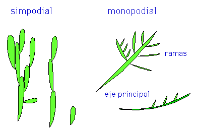 Equivalencia. Cuando los módulos conectados son morfológicamente similares, el sistema de ramas es homocládico. El conjunto de módulos homogeneos más simple es el sistema simpodial. Las variaciones dependen si el siguiente modulo se conecta distalmente al anterior o si esta conectado basalmente. También varia el numero de módulos que se ramifican del anterior y el numero de simpodios conectados secuencialmente. En cambio, en un sistema heterocládico, los módulos conectados en secuencia son morfológicamente heterogeneos. El modulo ontogenéticamente anterior se denomina primario y los subsecuentes se denominan ordinalmente (secundarios, terciarios, etc.). En la mayoría de los casos, los módulos secundarios y terciarios son de crecimiento determinado, por lo que estructuralmente se distingue un sistema monopodial en el que el tallo primario es de crecimiento indeterminado y un sistema subordinado de ramas. El conjunto que incluye un módulo primario y la serie conectada de varios módulos ontogenéticamente subordinados a el (secundarios, terciarios, etc.) forman una unidad estructural denominada "sistema de ramas". |