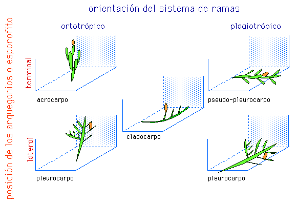 El conjunto de módulos puede estar orientado verticalmente o puede ser postrado. La orientación de los módulos es independiente de la posición de los arquegonios si es terminal (acrocarpica) o lateral (pleurocarpica). La mayoría de los musgos acrocarpicos son ortotropicos. La mayoría de los musgos pleurocarpicos son postrados. No obstante hay varios musgos que combinan tipos de orientación del sistema de ramas y tipos de posición de los arquegonios. |