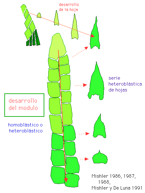 Esta serie de segmentos se denomina módulo, ya que deriva de una célula apical y constituye una unidad ontogenética y estructural fundamental. Los módulos pueden ser determinados o indeterminados dependiendo si la célula apical continua dividiéndose o no. La mayoría de los musgos consisten de hecho de una serie conectada de módulos determinados, a los que comúnmente denominamos tallos y ramas. |
