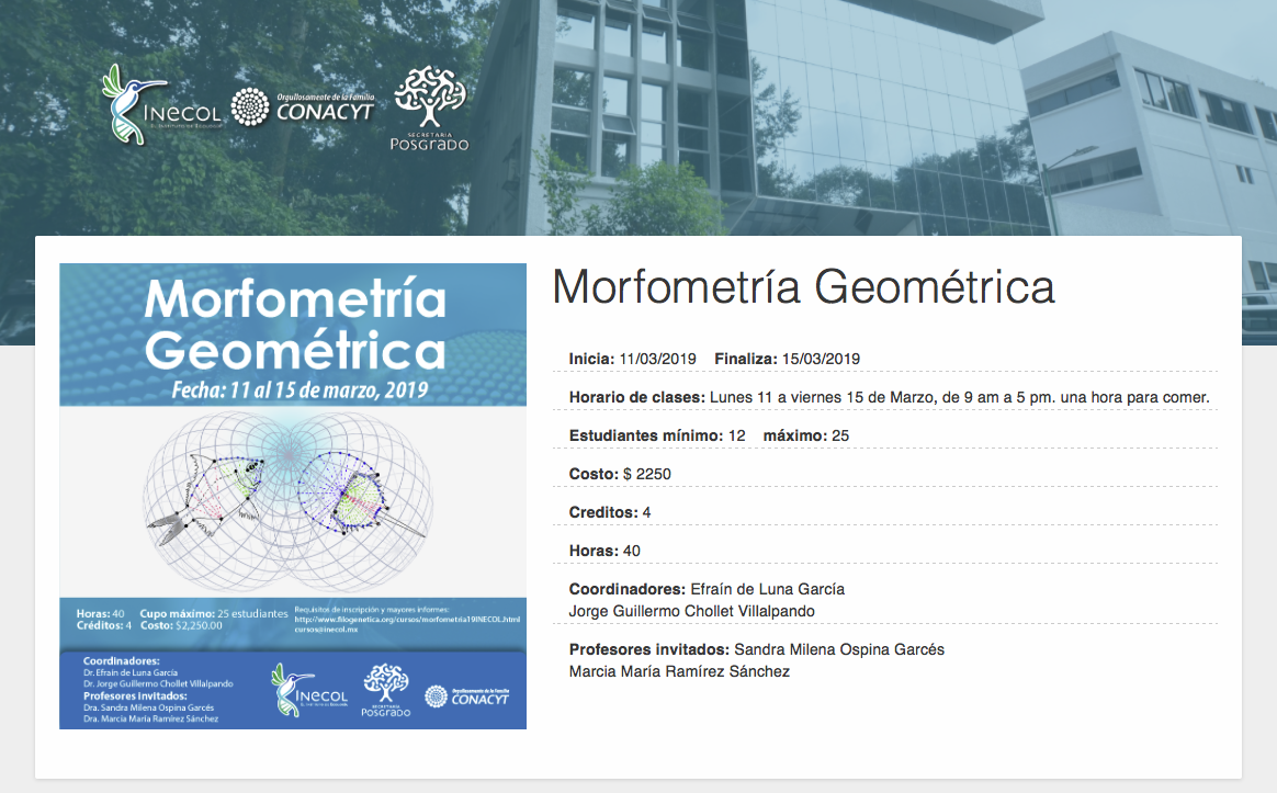 Este curso es una introducción a la teoría y métodos principales de la MG. Se ha ofrecido anualmente con el aval de varios posgrados desde 1999. Los últimos cursos han sido en los posgrados del INECOL-Xalapa (2013), en el CIB- UAEH de Pachuca (2013), Facultad de Ciencias Biológicas, Universidad Ricardo Palma, CEBIO, Lima, Perú (2015) y Ciencias Biológicas de la UAT en Tlaxcala (2016).
