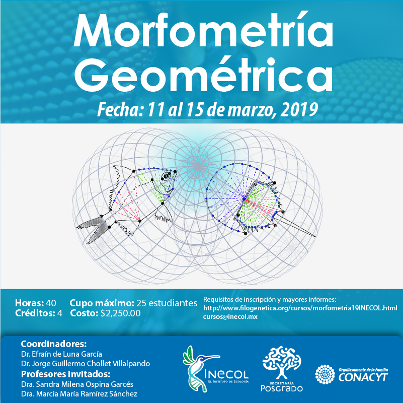 Objetivos: El curso provee instrucción teórica y experiencia práctica en los métodos para el registro de datos morfométricos (coordenadas de marcas y semi-marcas) y el análisis estadístico de la variación de la forma y tamaño. Reconocimiento oficial: El curso es de 40 horas y normalmente tiene un valor curricular equivalente a 4 créditos.